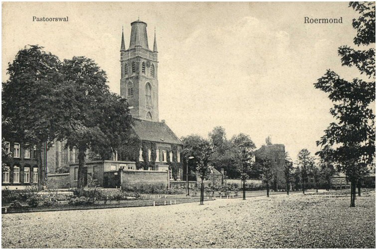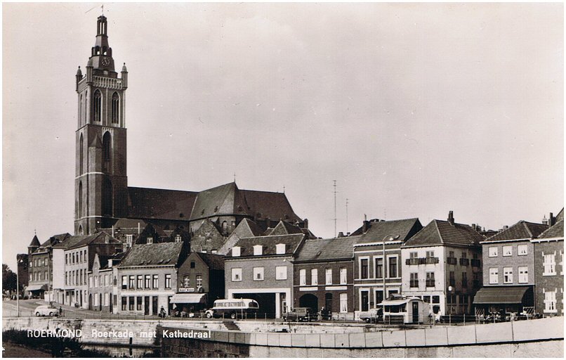 Buitenop te Roermond, Kathedraal met aan de voet het vroegere café Stad Weert |