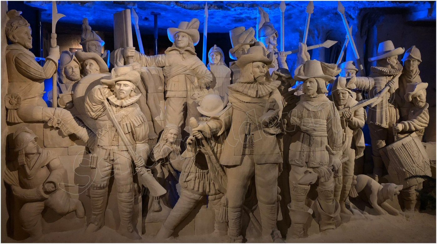 De Nachtwacht van Limburg, uitgehouwen uit mergelblokken. Te zien in Mergelrijk Valkenburg.