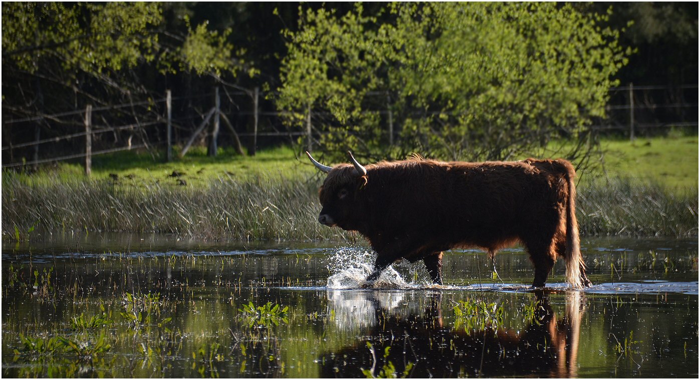 Lekker klotsend met de poten door het hoge water in een weidegebied in de Laurabossen te Weert