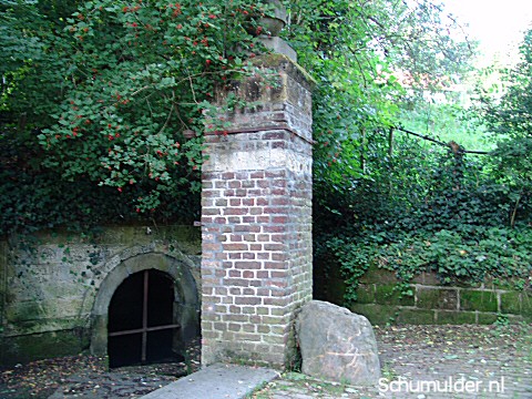 Later werd tegen de gemetselde pompzuil (met een natuurstenen bekroning) een waterpomp bevestigd waarmee de mensen hun drinkwater konden oppompen. De ijzeren banden waarmee de pompinstallatie aan de zuil was bevestigd zijn nog aanwezig. De pompzuil is afgedekt met een hardstenen ornament. |