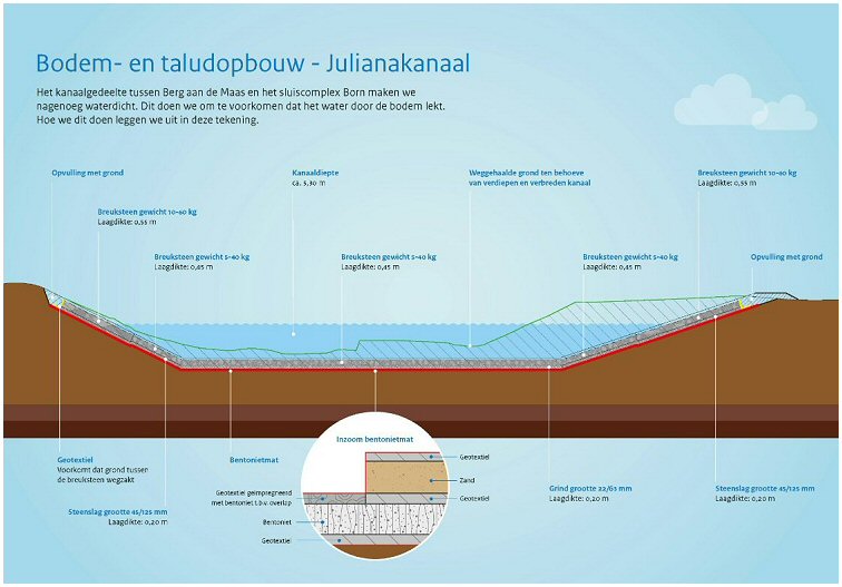 De bodem en de taludopbouw van het kanaal zijn door o.a. bentonietmatten
