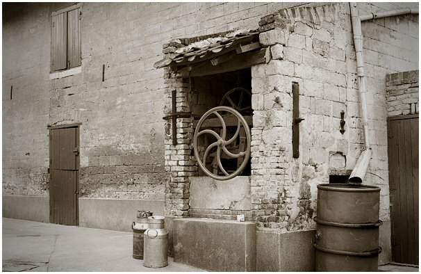 Het pomphuis is opgebouwd uit drie delen gekapte natuursteen.